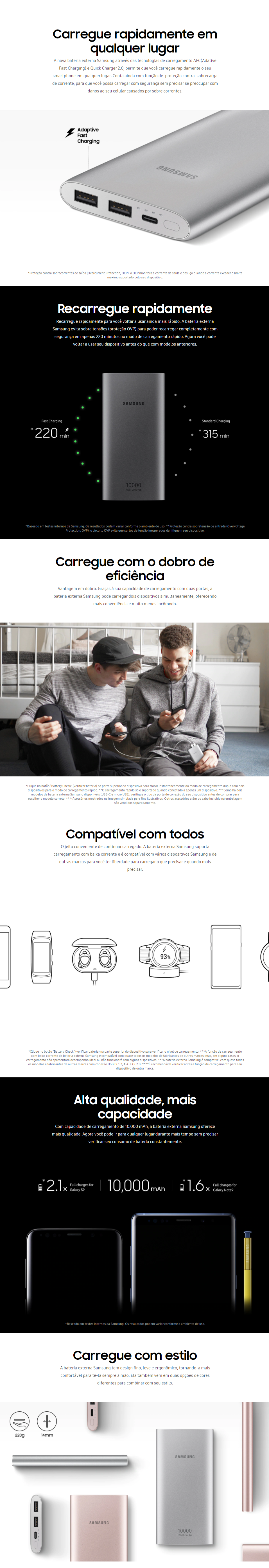 Carregue rapidamente em qualquer lugar: A nova bateria externa Samsung através das tecnologias de carregamento AFC(Adative Fast Charging) e Quick Charger 2.0, permite que você carregue rapidamente o seu smartphone em qualquer lugar. Conta ainda com função de proteção contra sobrecarga de corrente, para que você possa carregar com segurança sem precisar se preocupar com danos ao seu celular causados por sobre correntes.