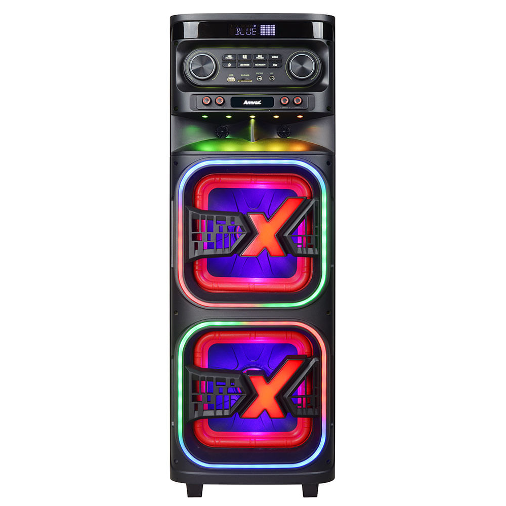 A ATX 2108M oferece 2100W RMS com dois woofers de 10" de alto impacto. Som potente com Bluetooth, USB, TWS e rádio FM integrados. Entradas para microfone e instrumento com prioridade e controle de eco. Iluminação LED e estrutura robusta para grandes eventos.