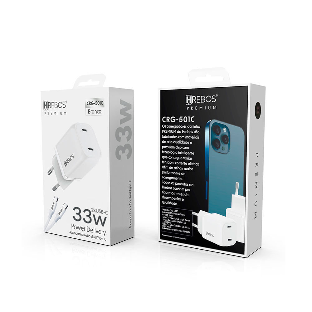 Carregador de Parede Hrebos Premium, 2 entradas USB-C para USB-C, 33W, com Cabo - CRG-501C | Branco
