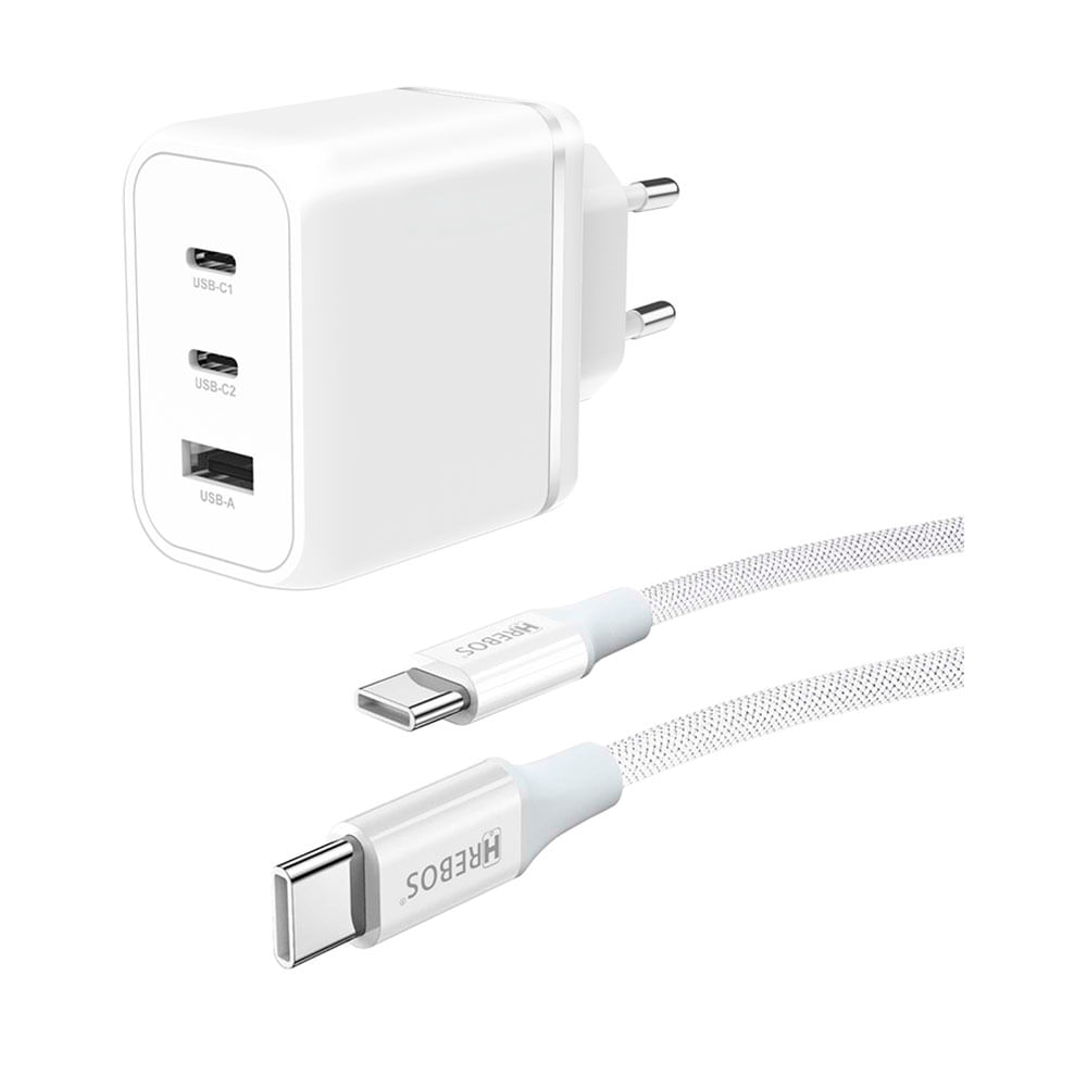 Carregador Premium Hrebos 65W CRG-504c, recarga ultrarrápida com saídas USB e USB-C, tecnologia Power Delivery, acompanha cabo Branco