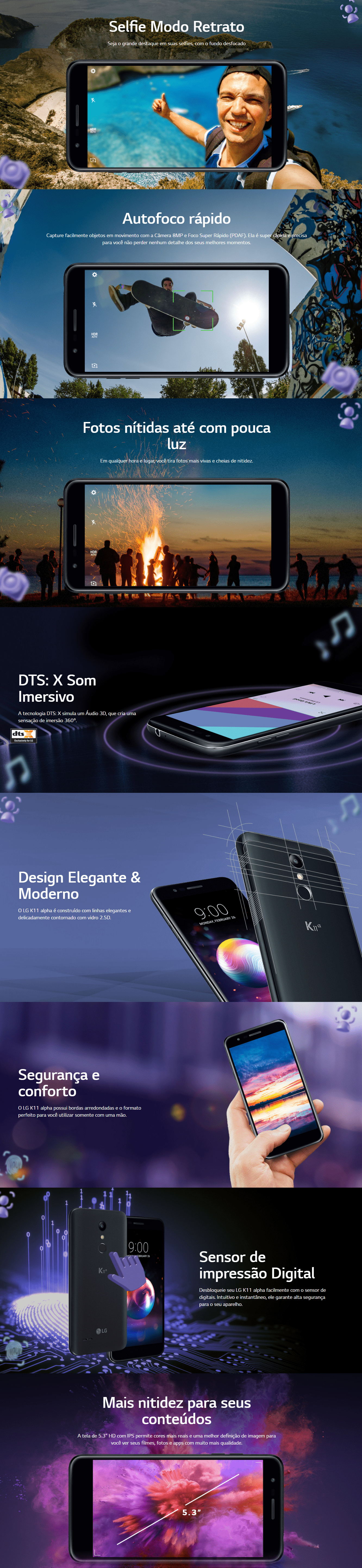 Desbloqueie seu LG K11 Alpha facilmente com o sensor de digital. Intuitivo e instantâneo, ele garante alta segurança para o seu aparelho.A tecnologia DTS: X simula um Áudio 3D, criando uma nova sensação de realismo e imersão 360º.